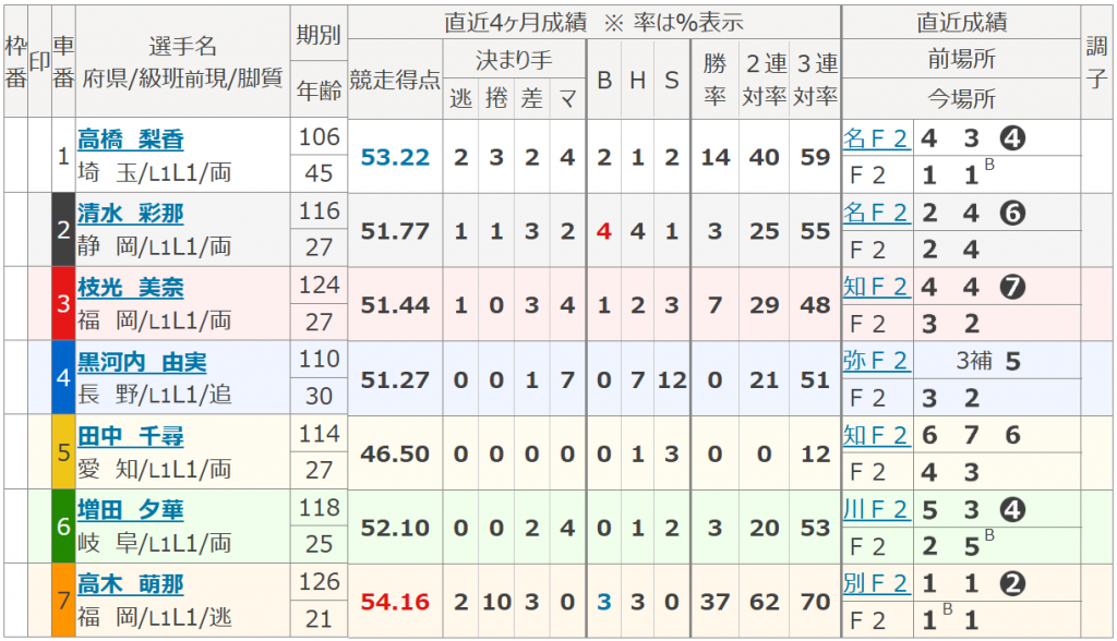 11R A級決勝 出場選手【発走予定時刻 15:54】