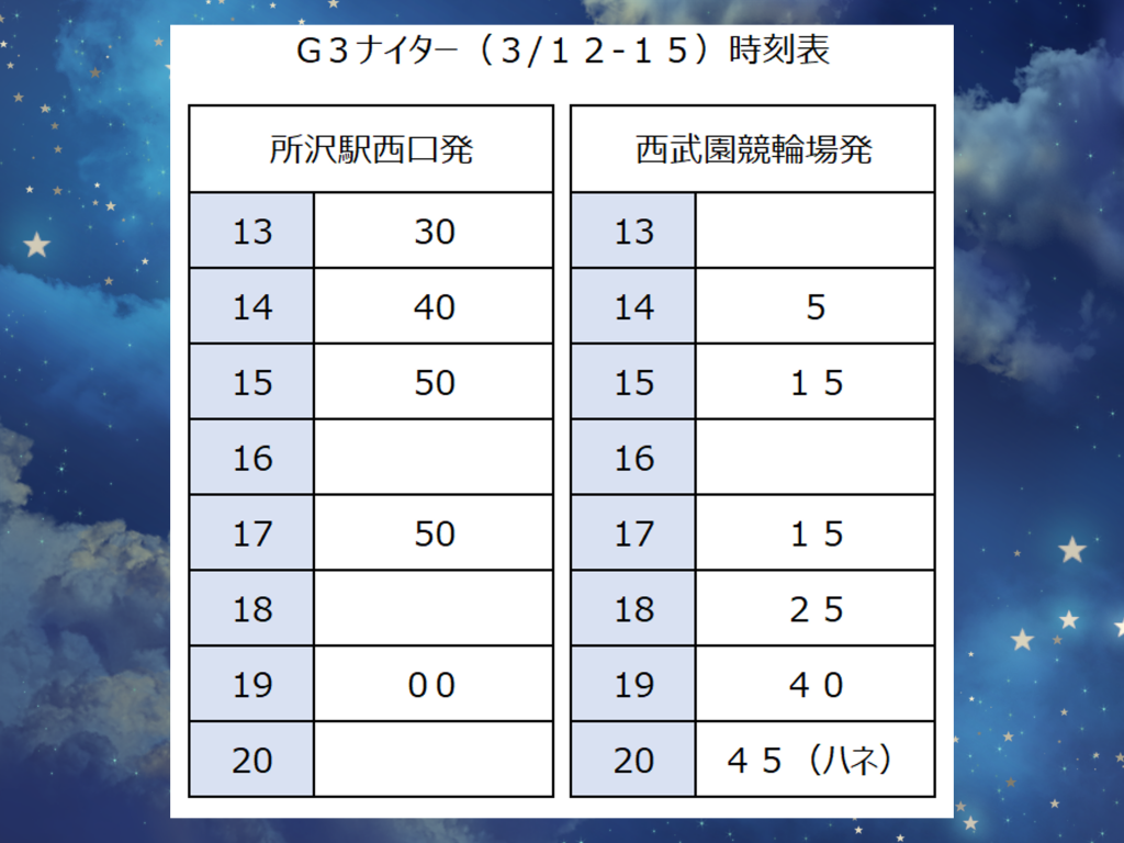西武園競輪 ブルーウイングナイトレース G3「臨時無料バス時刻表」